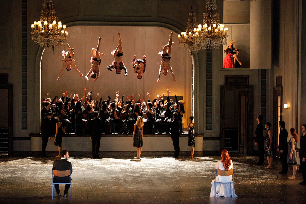 Heaven was brightly illuminated. All ‘residents’ – choristers as well as dancers – were totally clad in white. I’ve no clue why white powder fell like snow through the broken skylights, greeted by everyone as if divine manna. Though Orpheus blundered in his venture thanks to L’Amour’s intervention, he got Eurydice back. The apotheosis took place under L’Amour’s command – a role she obviously relished – as a ceremony reminiscent of a second wedding. The choristers, placed on the rear stage, represented the guests. Orpheus and his beloved sat with their backs to the audience on either sides of the hall and all watched the dances provided in celebration of the lovers’ reunion. This was the main moment for the four solo couples – Rachele Buriassi, Alessandra Tognoloni, Angelina Zuccarini, Elizabeth Wisenberg, Alexander Jones, Roland Havlica, Damiano Pettenella and Nikolay Godunov in varying pairing – to present themselves in the most proper light. And so they did! Also L’Amour’s five delegates had their moment in a flight stunt, cheerfully hovering above the choristers’ heads. The rejoicing, however, was premature. In the thick of the festive mood Eurydice suddenly collapsed and died. Surrounded by the distraught crowd, one of the dancers traced her contour with white chalk. Orpheus crouched in desperation in the other corner and, when walking off, did not even look at the dead Eurydice. Slowly everyone retook their initial position, stood around, waited. The plot had come full circle.