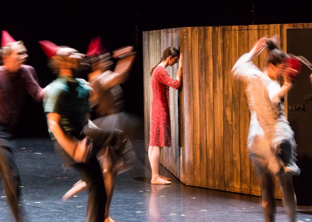 the wall. The way the wall is shaped the dancers can never leave during the show, instead they have to wait, sometimes for quite some time, until re-emerging in front. A glance from the wings reveals the secret life onstage.