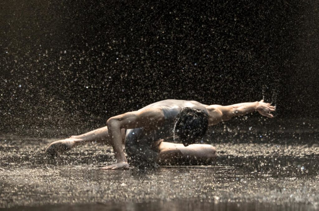 If the dance wasn’t special, the patterns of the billowing smoke in front of the black backdrop certainly were. They vanished the moment four valves high above in the ceiling opened, and columns of water drizzled down. Soon, water covered the floor and drenched the dancers. Steps were taken more cautiously, but they were effect-seeking splashy. On this slippery ground three couples danced pas de deux: Anna Khamzina / Jan Casier; Elena Vostrotina / William Moore, and Yen Han / Matthew Knight. The way tall Vostrotina unfolded her long legs brought a tinge of balletic lightness to the physicality of the performance. In the last scene brawny Knight bent protectively over petite Han. While she walked offstage, the drizzle stopped, the columns of water sank, and Knight stood motionless, stretching his arms sideways like a bird with a crippled wing.