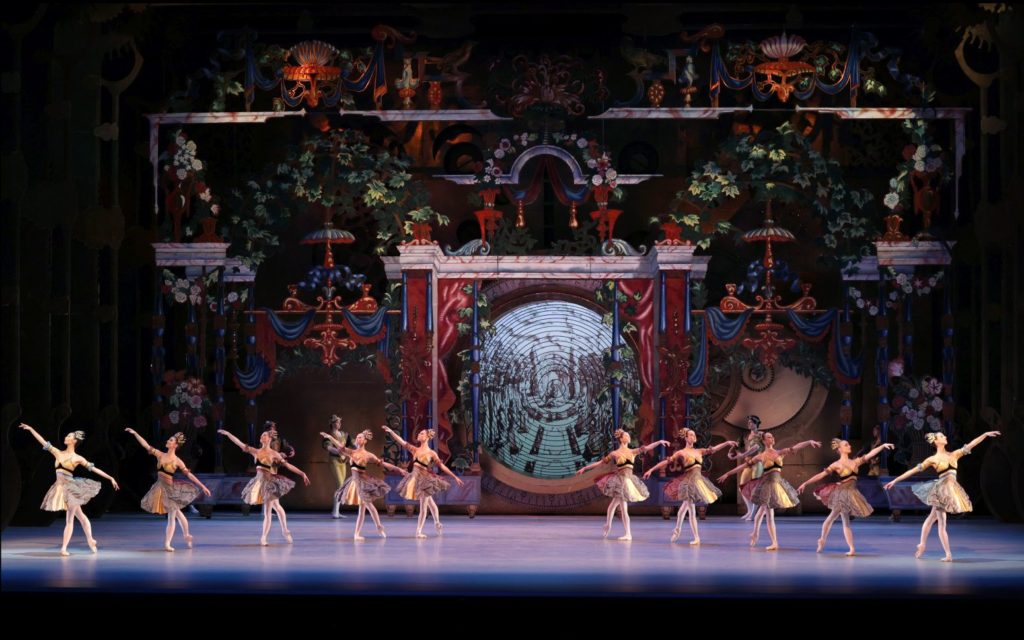 Van Schayk and Eagling replace the Sugar Plum Fairy and her sweets-land for a Sleeping Beauty-like fairy garden, in which a large corps of dancers in floral costumes arranges and re-arranges itself in eye-catching patterns. Here, Clara is presented with her first tutu and dances a picture-book-esque Grand Pas de Deux with the Prince.
