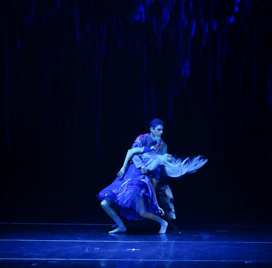 Petrov and Merkushev choreographed the creepy Bluebeard. Its hero was pulled onto the eerily blue-lit stage and entangled in a knitted webwork as heavy as lead. Though aged and weighed down by inner struggle, he was a fighter by nature. His hand trembled, and his gait was heavy after he freed himself from the hunter’s encirclement. But his figure still incited shrieks from the seven women who dared to approach him (or arose from his hallucination).